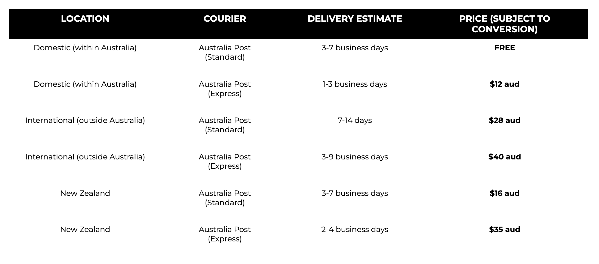 All orders are shipped from our warehouse in Sydney, Australia via Australia Post.